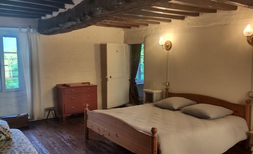 Grote, typisch Normandische slaapkamer, met balkenplafond, eiken parketvloer en onregelmatige muren die bijdragen aan de charme. Grote en-suite badkamer met bad/douche, bidet, wastafel en toilet, gelegen in een voormalige boerderij in een groene omgeving met appelbomen. Uitzicht over de tuin en het omliggende platteland. Afgesloten parkeerplaats voor auto's en fietsen.