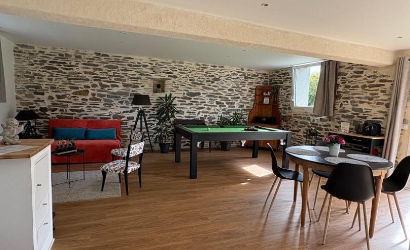 Grote woonkamer met biljarttafel, zithoek met slaapbank (140*190), eethoek en keuken die uitkomt op de tuin. 1 aparte slaapkamer met tweepersoonsbed (160*200) en badkamer en-suite. Aparte WC.
