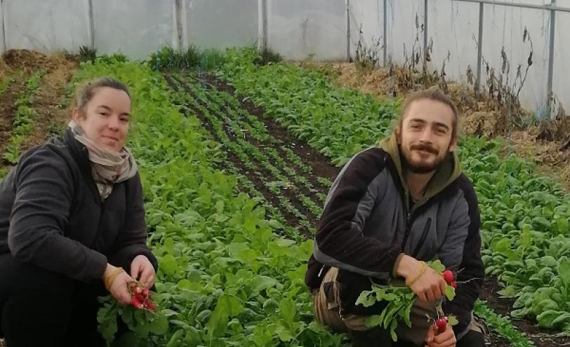 Onze tuin van 5.000 m² wordt met de hand bewerkt, met behulp van levende grondbewerking (geen grondbewerking, mulchen, groenbemesting, enz.) en agrobosbouw. We hebben ook een gediversifieerde boomgaard van 5.000 m² (appels, peren, kersen, pruimen, rood fruit, enz.) en we produceren groentezaailingen die tuiniers kunnen uitplanten.