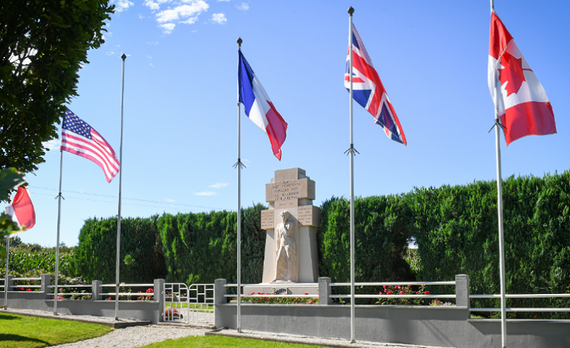 In een aangelegd park, een monument opgericht op de plek waar 11 leden van het P.T.T. netwerk in La Manche werden neergeschoten op 15 juni 1944 - Informatiepanelen ter plaatse.